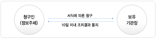청구인 정보주체가 서식에따른 청구를 하면, 보유기관장은 10일이내 청구인(정보주체)에게 통보한다. 보유기관장이 청구접수 후 10일 이내 열람을 시행한다. - ○ 개인정보파일은 「개인정보 보호법」제35조(개인정보의 열람)에 따라 자신의 개인정보에 대한 열람을 요구할 수 있습니다. 다만, 개인정보 열람 요구는 법 제35조 5항에 의하여 다음과 같이 제한될 수 있습니다.
